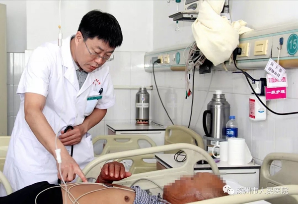 众所周知,心脏病的发病往往都是以起病急、来势凶为常态,作为一名心内科医生,李国正是凭借着技艺娴熟的诊治水平和沉着机敏的抢救能力,让一个个患者起死回生。8月份的一天下午5:36,正值下班交接班时间,一位65岁老人董某,突发胸痛,大汗淋漓,急诊120入院,心电图示急性下壁正后壁心肌梗死,收住心内科监护室,李国带领监护室医务人员严密监控患者病情,住院后患者病情再度恶化,突然意识丧失,心电监护仪示室颤,李国立即给患者实施电除颤,经抢救患者意识恢复,但心电不稳定,反复室颤、意识丧失,李国果断决定给病人行气管插管,上呼吸机辅助呼吸,做胸外按压,持续电除颤67次,生命攸关的时刻,李国寸步不离的坚守在患者床旁。